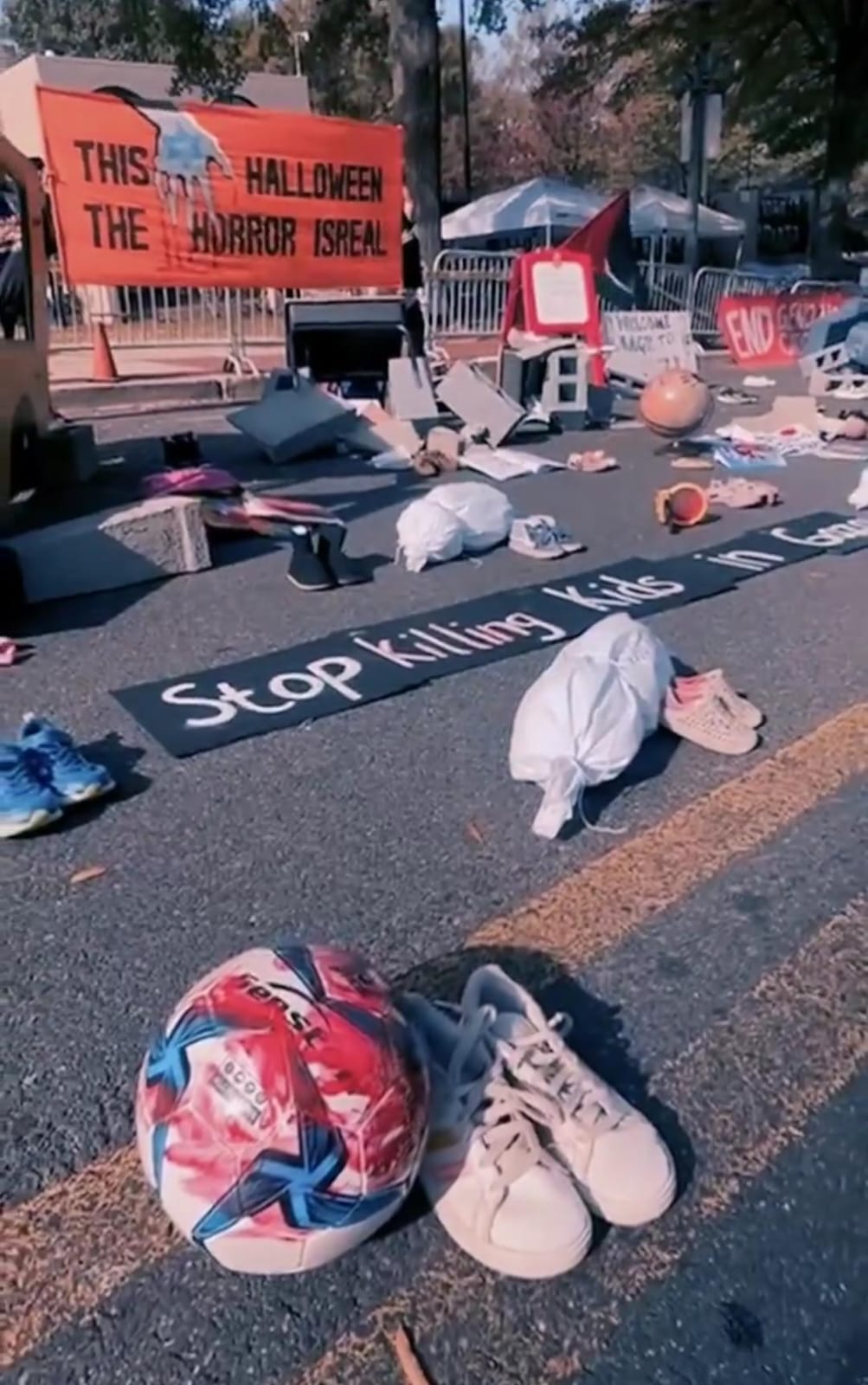 توقف عن قتل الأطفال.. هكذا كانت الكلمات التي شاركها هؤلاء النُشطاء على الأرض أمام بوابة السفارة الإسرائيلية في أمريكا، احتفالًا بـ عيد الهالوين الذي يحييه الأمريكيون في أواخر شهر أكتوبر من كل عام.