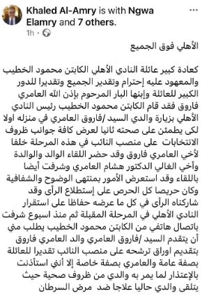 ونشر خالد العامري شقيق الراحل العامري فاروق بيانا رسميا عبر حسابه على موقع التواصل الاجتماعي فيسبوك، جاء فيه: كعادة كبير عائلة النادي الأهلي الكابتن محمود الخطيب والمعهود عليه احترام وتقدير الجميع وتقديرا للدور الكبير للعائلة وابنها البار المرحوم بإذن الله العامري فاروق، فقد قام الكابتن محمود الخطيب رئيس النادي الأهلي بزيارة والدي السيد فاروق العامري، في منزله، أولا لكى يطمئن على صحته، ثانيا لعرض كافة جوانب ظروف الانتخابات على منصب النائب في هذه المرحلة خلفا لأخي العامري فاروق.