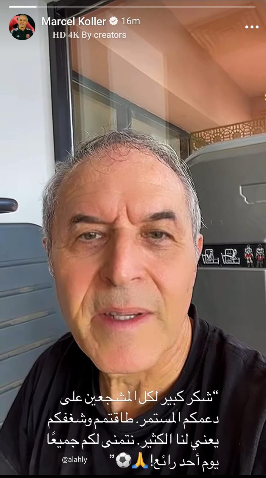 وقال مارسيل كولر في رسالة خاصة لجماهير الأهلي نشرها عبر حسابه الشخصي على موقع التواصل الاجتماعي فيسبوك: شكر كبير لكل المشجعين على دعمكم المستمر طاقتكم وشغفكم يعني لنا الكثير نتمنى لكم جميعا يوم أحد رائع.