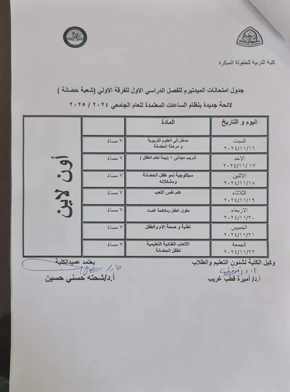 وينشر القاهرة 24، جدول امتحانات الميدتيرم لطالبات الفرقة الأولى بكلية طفولة مبكرة الزقازيق في السطور التالية، والتي جاءت كالتالي: