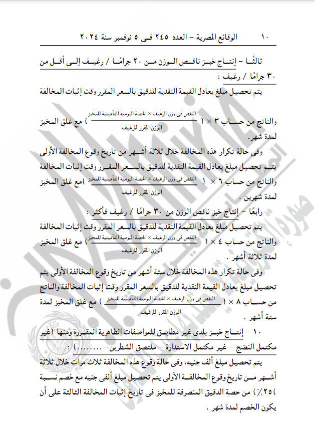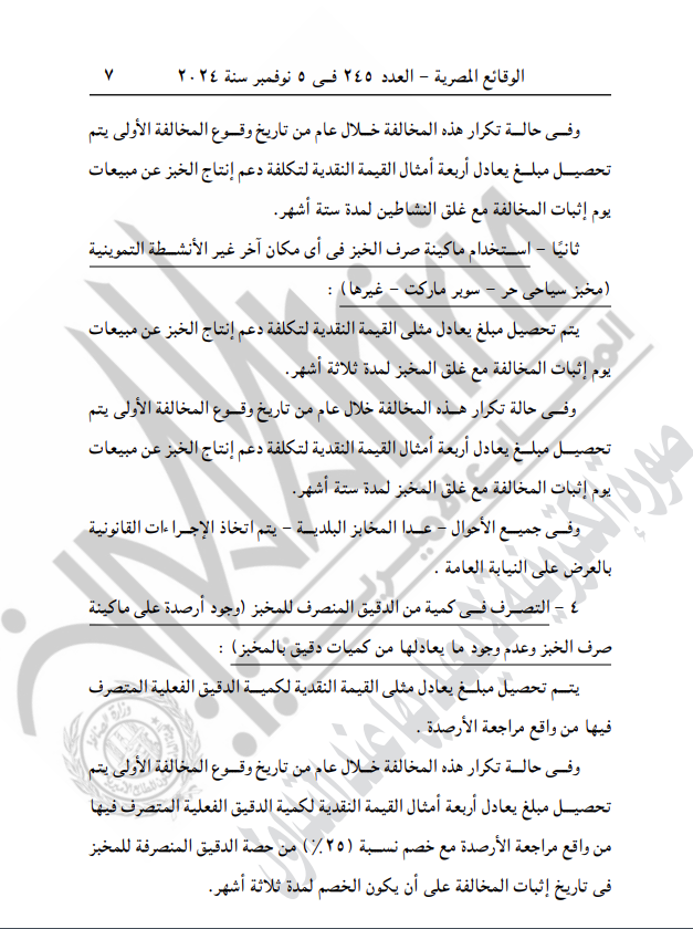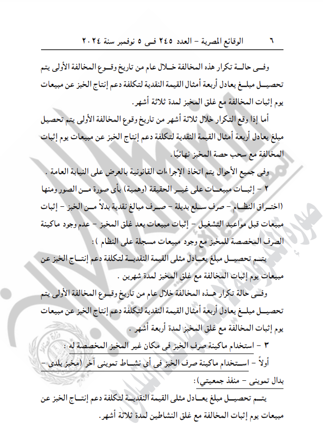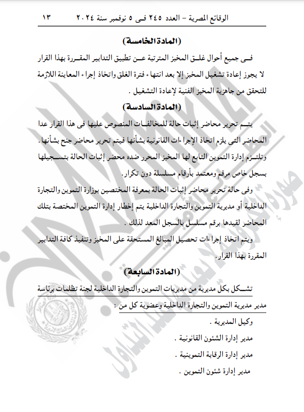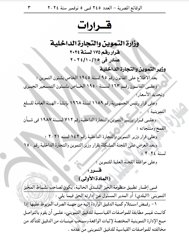 نشرت جريدة الوقائع المصرية في عددها رقم 245، الصادر في 5 نوفمبر 2024، قرار وزارة التموين والتجارة الداخلية رقم 175 لسنة 2024، بشأن تطبيق منظومة الخبز البلدي الحالية، وحق صاحب المخبز رفض استلام كمية الدقيق الواردة إليه إذا كانت غير مطابقة للمواصفات.