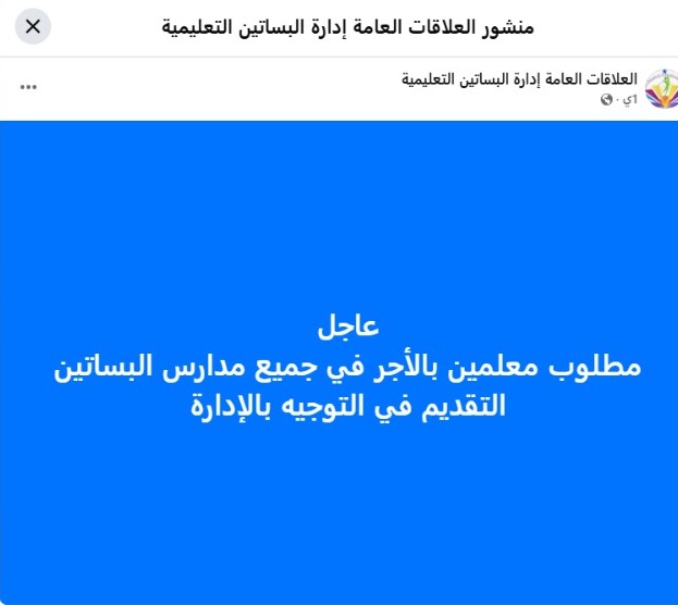 وكتبت إدارة البساتين التعليمية عبر صفحتها الرسمية على موقع التواصل الاجتماعي فيس بوك: مطلوب معلمين بالأجر في جميع مدارس البساتين، والتقديم في التوجيه بالإدارة.