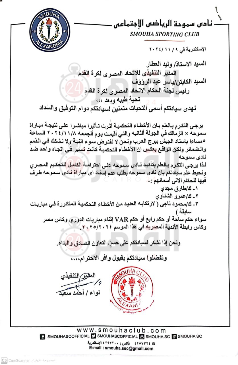 خطاب سموحة إلى اتحاد الكرة بشأن حكام مباراة الزمالك في الدوري