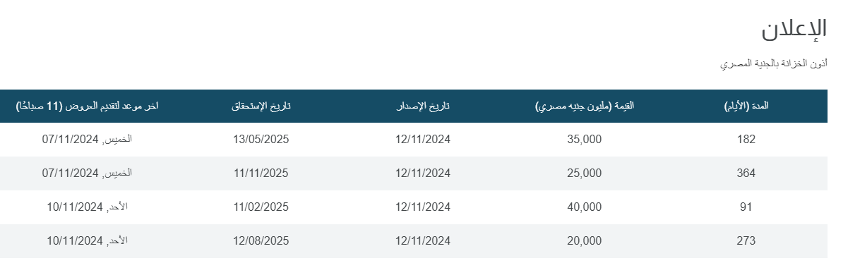 كما يطرح البنك المركزي أيضًا، أذون خزانة أخرى بقيمة 20 مليار جنيه، لمدة 9 أشهر -273 يوما، إذ يتم إصدار المبلغ في 12 نوفمبر الجاري، على أن يتم استحقاقه في 12 أغسطس 2025، ليكون إجمالي قيمة أذون الخزانة المطروحة 60 مليار جنيه.