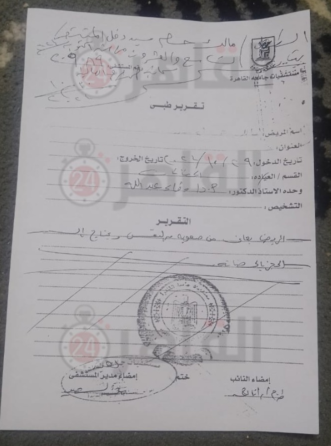 حصل القاهرة 24، على التقرير الطبي لـ الطفل مالك صاحب الـ7 أشهر، الذي تعرض لواقعة إهمال داخل حضانة مستشفى قصر العيني.