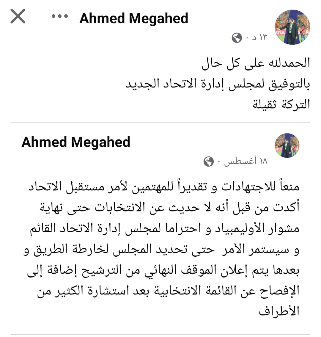 وكتب أحمد مجاهد عبر صفحته على موقع التواصل الاجتماعي فيسبوك: الحمد لله على كل حال، بالتوفيق لمجلس إدارة الاتحاد الجديد، التركة ثقيلة.