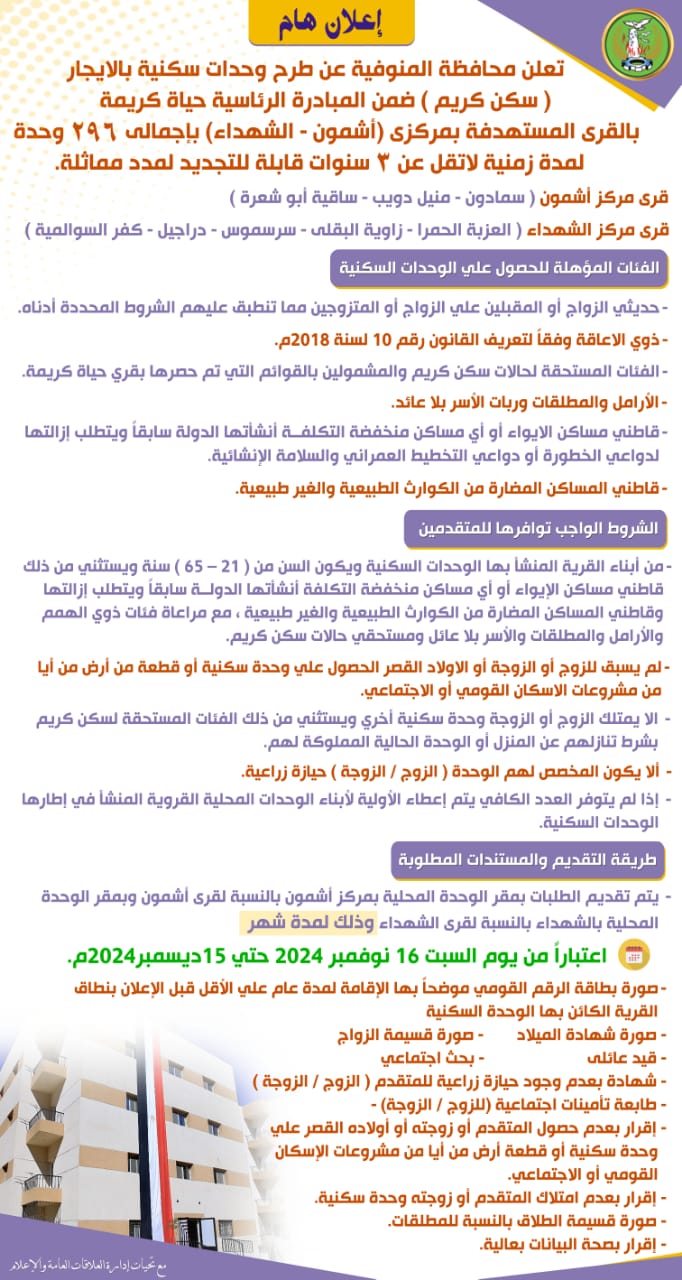 أعلن اللواء إبراهيم أبو ليمون محافظ المنوفية، طرح وحدات سكنية بالإيجار «سكن كريم»، ضمن المبادرة الرئاسية حياة كريمة، بقرى سمادون ومنيل دويب وساقية أبو شعرة، بمركز ومدينة أشمون، وقرى العزبة الحمرا، وزاوية البقلي، سرسموس، دراجيل، كفر السوالمية بمركز ومدينة الشهداء، بإجمالي 296 وحدة لمدة زمنية 3 سنوات قابلة للتجديد لمدد مماثلة.