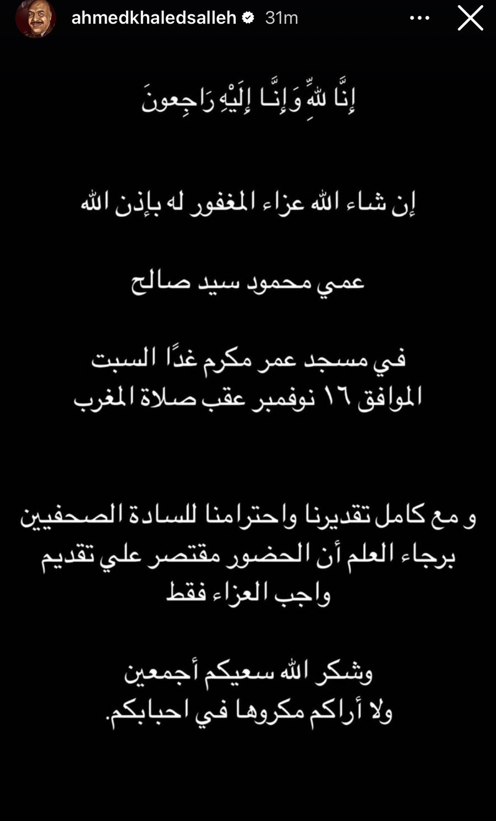وأعلن أحمد خالد صالح، مكان وموعد استقبال عزاء محمود صالح شقيق والدة الراحل خالد صالح من خلال حسابة الخاص انستجرام قائلًا: إنا لله وإنا إليه راجعون، إن شاء الله عزاء المغفور له بإذن الله عمي محمود سيد صالح في مسجد عمر مكرم غدًا السبت الموافق 16 نوفمبر عقب صلاة المغرب.