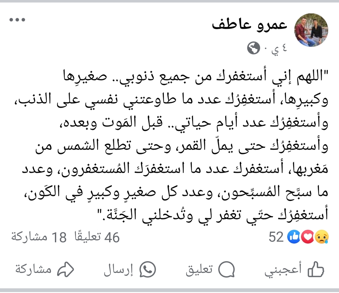 وأضاف: الشاب الفقيد نشر بالأمس منشورًا عبر حسابه الشخصي على فيسبوك، نعى فيه صديقه هيثم رشاد، والذي رحل أيضا في ذات اليوم متأثرا بإصابته في حادث تصادم سيارة ملاكي بأخرى نقل بمحافظة سوهاج، وسبقه بمنشور آخر دعاء لنفسه جاء فيه: اللهم إني أستغفرك من جميع ذنوبي.. صغيرِها وكبيرِها، أستغفِرُك عدد ما طاوعتني نفسي على الذنب، وأستغفِرُك عدد أيام حياتي.. قبل المَوت وبعده، وأستغفِرُك حتى يملّ القمر، وحتى تطلع الشمس من مَغربها، أستغفرك عدد ما استغفرَك المُستغفرون، وعدد ما سبَّح المُسبِّحون، وعدد كل صغيرٍ وكبيرٍ في الكَون، أستغفِرُك حتّي تغفر لي وتُدخلني الجَنَّة."