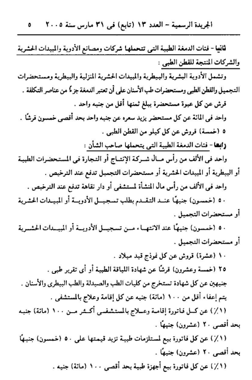 - واحد في الألف من رأس مال شركة الإنتاج أو التجارة في المستحضرات الطبية أو مستحضرات التجميل تدفع عند الترخيص.