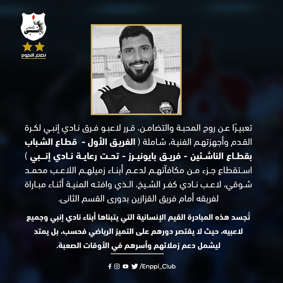 تعبيرًا عن روح المحبة والتضامن، قرر لاعبو فرق نادي إنبي لكرة القدم وأجهزتهم الفنية، شاملة الفريق الأول، قطاع الشباب بقطاع الناشئين، فريق بايونيرز تحت رعاية نادي إنبي، استقطاع جزء من مكافآتهم لدعم أبناء زميلهم اللاعب محمد شوقي، لاعب نادي كفر الشيخ، الذي وافته المنية أثناء مباراة لفريقه أمام فريق القزازين بدورى القسم الثانى.