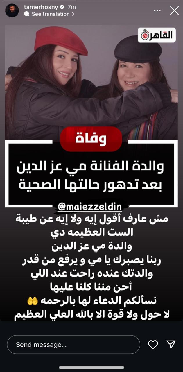 وكتب تامر حسني، عبر خاصية الاستوري على حسابه الشخصي بموقع إنستجرام: مش عارف أقول إيه ولا إيه عن طيبة الست العظيمة دي والدة مي عز الدين، ربنا يصبرك يا مي ويرفع من قدر والدتك عنده، راحت للي أحن مننا كلنا عليها، نسألكم الدعاء لها بالرحمة والمغفرة.. لا حول ولا قوة إلا بالله العلي العظيم.