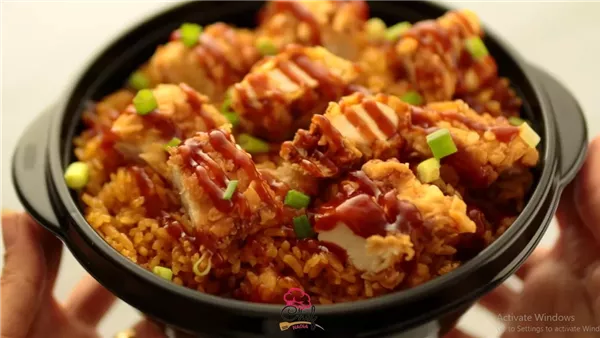 - قدمي الأرز في طبق التقديم، وزينيه بقطع دجاج كنتاكي المقرمشة وصوص الريزو.