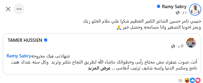 وكتب رامي صبري منشورًَا، عبر حسابه الشخصي بموقع التواصل الاجتماعي فيس بوك، يرد فيه على تعليق تامر حسين، إذ قال: حبيبي تامر حسين الشاعر الكبير العظيم شكرًا على كلام الحلو زيك، ويجز أخويا الصغير وأنا مسامحه وحصل خير.