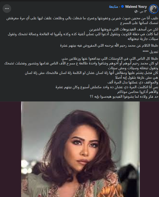 تابع: طبعًا الكلام عن محمد رحيم الله يرحمه اللي المفروض فيه بينهم عشرة، لو كان محمد رحيم أبوهم أو أخوهم وشافوا واحدة طالعة على مسرح آلاف الناس قدامها وبتصور وفضلت تضحك وتقول نبعتله وسيئات ومش سيئات، كان فضل يشتم عليها ومقالش أنها زلة لسان عشان لو الكلمة زلة لسان فالضحك مش زلة لسان، هي مش عارفة بتقول إيه أصلًا، والمواقف دي عملتها بدل المرة ألف، بس أنا اتكلمت المرة دي عشان ده واحد مكملش أسبوع وكان بينهم عشرة، والأهم أذكروا محاسن موتاكم، حد فكر ولاده لما يشوفوا الفيديو هيحسوا بإيه؟.