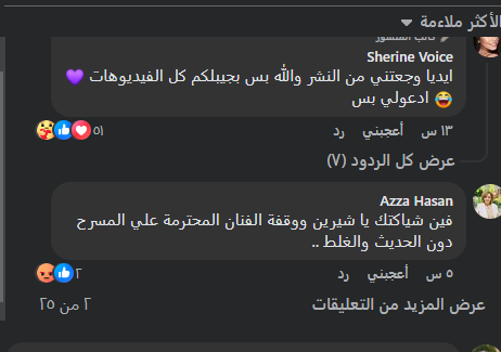 وجاءت تعليقات الجمهور كالتالي: فين شياكتك يا شيرين ووقفة الفنان المحترم على المسرح دون الحديث والغلط، وقالت أخرى: لابسة جلابية فين الأناقة.
