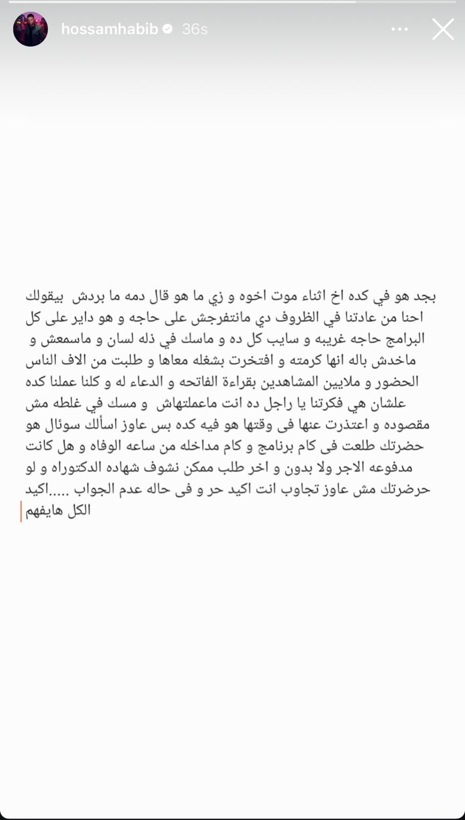 وكتب حسام حبيب منشورًا عبر حسابه الشخصي بموقع إنستجرام، قال فيه: بجد هو في كده أخ خلال موت أخوه وزي ما هو قال دمه ما بردش بيقولك إحنا من عادتنا في الظروف دي ما نتفرجش على حاجة، وهو داير على كل البرامج حاجة غریبة، وسایب كل ده وماسك في زلة لسان ومسمعش وماخدش باله أنها كرمته وافتخرت بشغله معاها، وطلبت من آلاف الناس الحضور وملايين المشاهدين بقراءة الفاتحة والدعاء له.