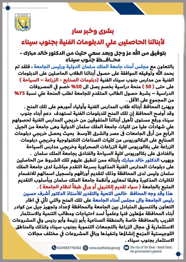 أعلن اللواء خالد مبارك محافظ جنوب سيناء في بيان صحفي له اليوم، أنه تواصل مع أعضاء كلية جامعة الملك سلمان بجنوب سيناء، لإعطاء منحة دراسية لطلاب الدبلومات الفنية بالمحافظة للدخول بجامعة الملك سلمان بتخفيض 50% من قيمة المصروفات الدراسية، شرط حصول الطالب المتقدم لجامعة الملك سلمان على 75% من المجموع الكلي.