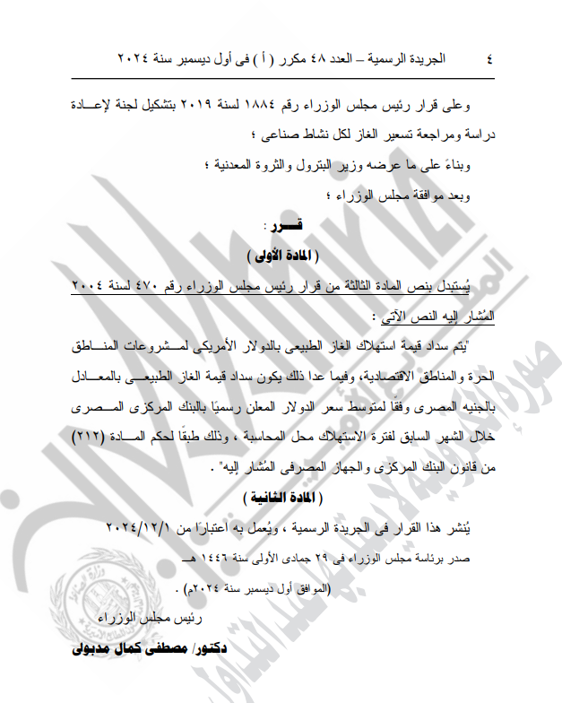 ونص قرار رئيس الوزراء، على أن يتم سداد قيمة استهلاك الغاز الطبيعي بالدولار الأمريكي لمشروعات المناطق الحرة والمناطق الاقتصادية، وفيما عدا ذلك يكون سداد قيمة الغاز الطبيعي بالمعادل بالجنيه المصري، وفقا لمتوسط سعر الدولار المعلن رسميا بالبنك المركزي المصري خلال الشهر السابق لفترة الاستهلاك محل المحاسبة، وذلك طبقا لحكم المادة (۲۱۲) من قانون البنك المركزي والجهاز المصرفي المشار إليه.