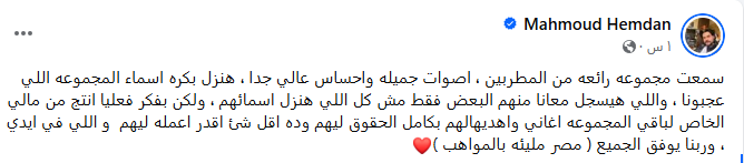وأضاف حمدان في منشوره أنه يفكر جديا في تمويل إنتاج أغانٍ لبقية المجموعة من ماله الخاص، مشيرا إلى أنه يهدف من خلال هذه الخطوة إلى تقديم دعم حقيقي للمواهب الواعدة وإهدائهم الأغاني بكامل حقوقها.. واختتم منشوره برسالة تحفيزية قائلا: مصر مليئة بالمواهب.