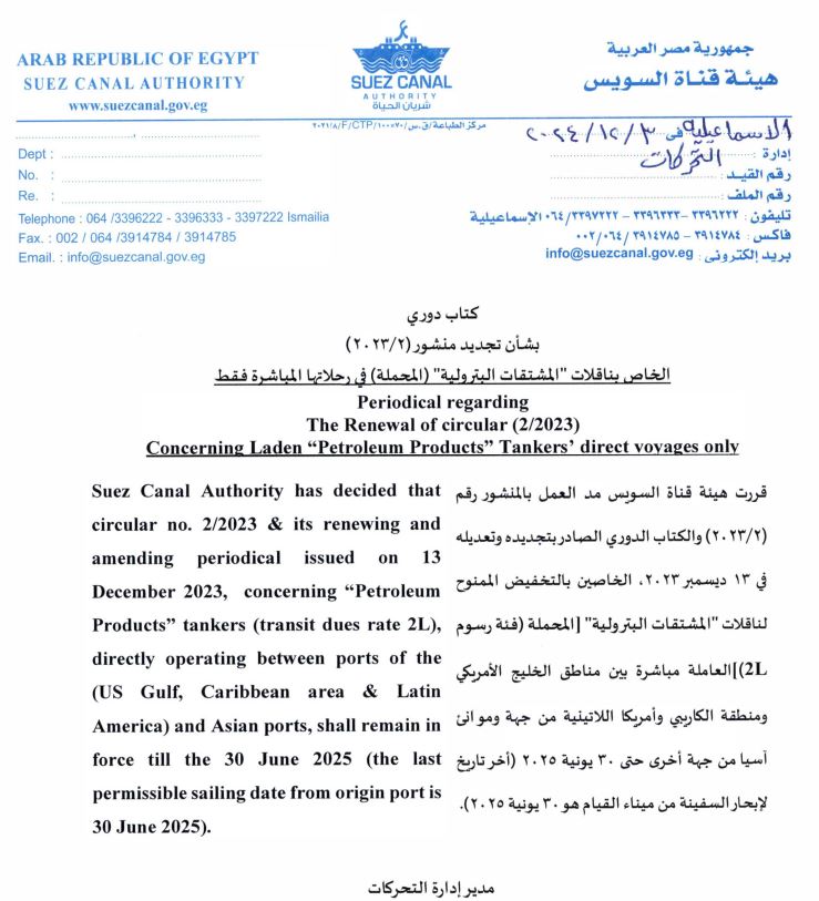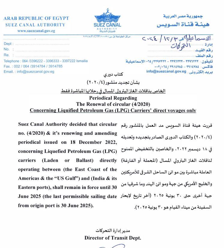 وقررت الهيئة مد العمل بالإعفاء الممنوح لسفن الحاويات (المحملة/الفارغة) القادمة مباشرة من موانئ شمال غرب أوروبا (مضافًا إليها ميناء طنجة) بداية من ميناء (Algeciras) ومتجهة مباشرة إلى ميناء (Port Klang) وما شرقه بموانئ جنوب شرق أسيا والشرق الأقصى من الزيادة في رسوم العبور العادية بنسبة 15% والمنصوص عليها بالفقرة (أ) من المادة الأولى من المنشور رقم (7/2023) حتى 30 يونية 2025 (أخر تاريخ لإبحار السفينة من ميناء القيام هو 30 يونية 2025).