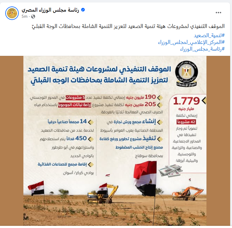 مجلس الوزراء: أكثر من 1700 مليار جنيه تكلفة 42 مشروعا تنمويا بالصعيد