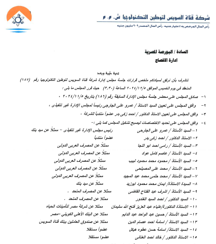 قرر مجلس إدارة شركة قناة السويس لتوطين التكنولوجيا، الموافقة على تعيين أسماء جديدة ضمن التشكيل الجديد لمجلس إدارة الشركة، على أن يكون على النحو التالي: