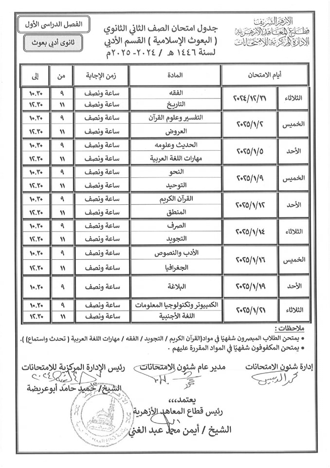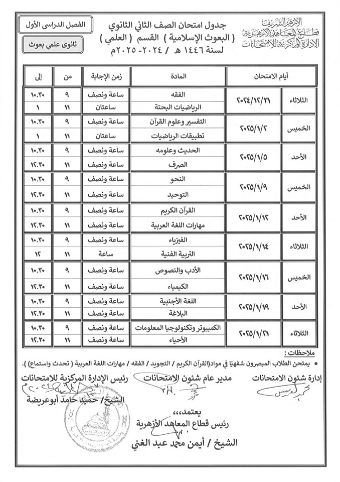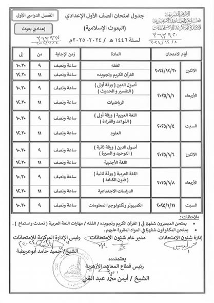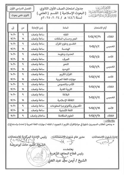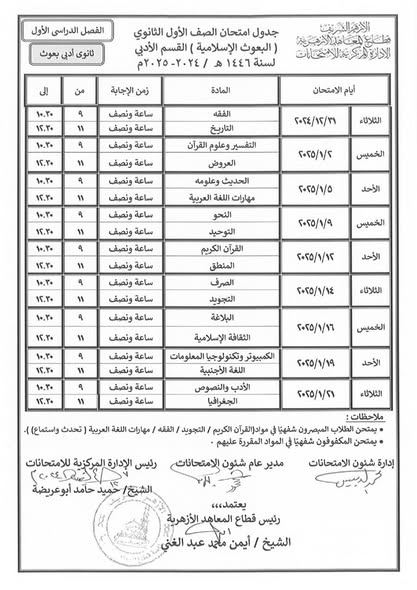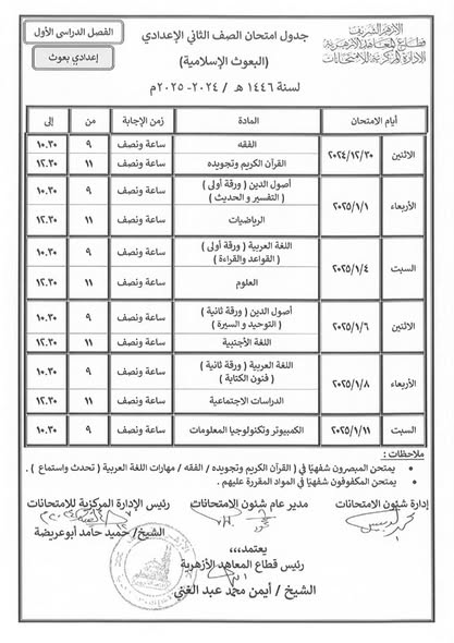 ننشر جداول امتحانات النقل لمعاهد البعوث الإسلامية للمرحلتين الإعدادية والثانوية