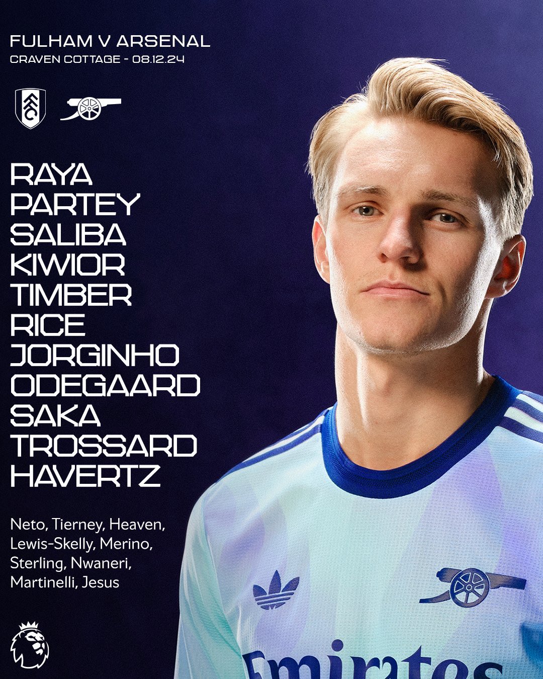 أعلن الإسباني ميكيل أرتيتا المدير الفني لفريق أرسنال، تشكيل لاعبيه لمواجهة فولهام، المقرر انطلاقها في الرابعة عصرًا، ضمن منافسات الجولة الخامسة عشر من مسابقة الدوري الإنجليزي الممتاز، على ملعب كرافين كوتيتج.