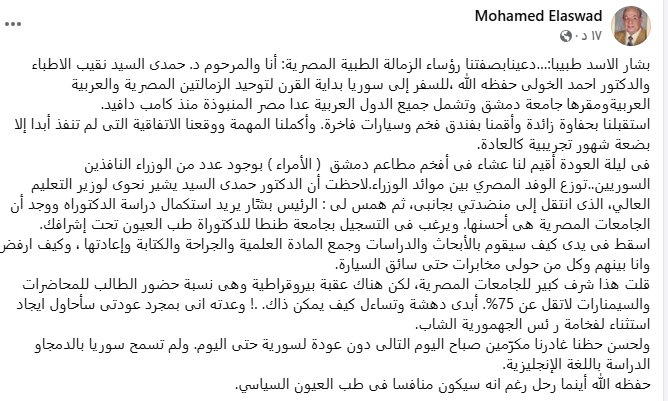 كشف محمد علي الأسود نائب رئيس جامعة طنطا، وأستاذ طب وجراحة العيون بالجامعة، تفاصيل طلب بشار الأسد دراسة الدكتوراه في الجامعات المصرية، حيث روى الأسود تفاصيل زيارة وفد الزمالة الطبية المصرية إلى سوريا في بداية القرن، الذي ضم الدكتور أحمد الخولي والدكتور حمدي السيد والدكتور الأسود، لتوحيد الزمالتين المصرية والعربية العربية ومقرها جامعة دمشق، وتشمل جميع الدول العربية عدا مصر المنبوذة منذ كامب دافيد.