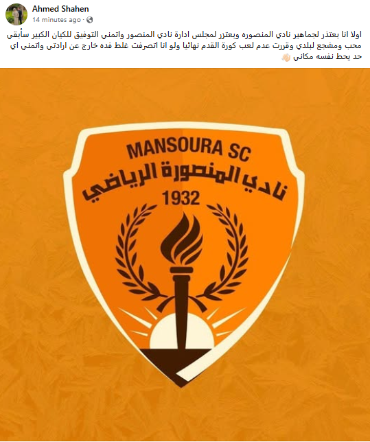 وقال أحمد شاهين لاعب المنصورة عبر حسابه الرسمي على موقع التواصل الاجتماعي فيسبوك: أولا أنا بعتذر لجماهير نادي المنصورة وبعتذر لمجلس إدارة نادي المنصورة، وأتمنى التوفيق للكيان الكبير، سأبقى محبا ومشجعا لبلدي. قررت عدم لعب كورة القدم نهائيا، ولو أنا اتصرفت غلط فده خارج عن إرادتي، وأتمنى أي حد يحط نفسه مكاني.