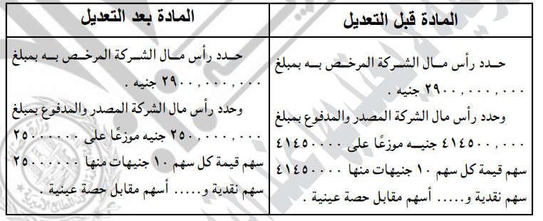 - زيادة رأس المال المصدر والمدفوع من 414،500،000 جنيه إلى 1،348،248،249 جنيها خصمًا من مستحقات الشركة القابضة لدى الشركة والبالغة 873162780 جنيها بالإضافة إلى مبلغ 60585469 جنيها قيمة رصيد الاحتياطي الرأسمالي.