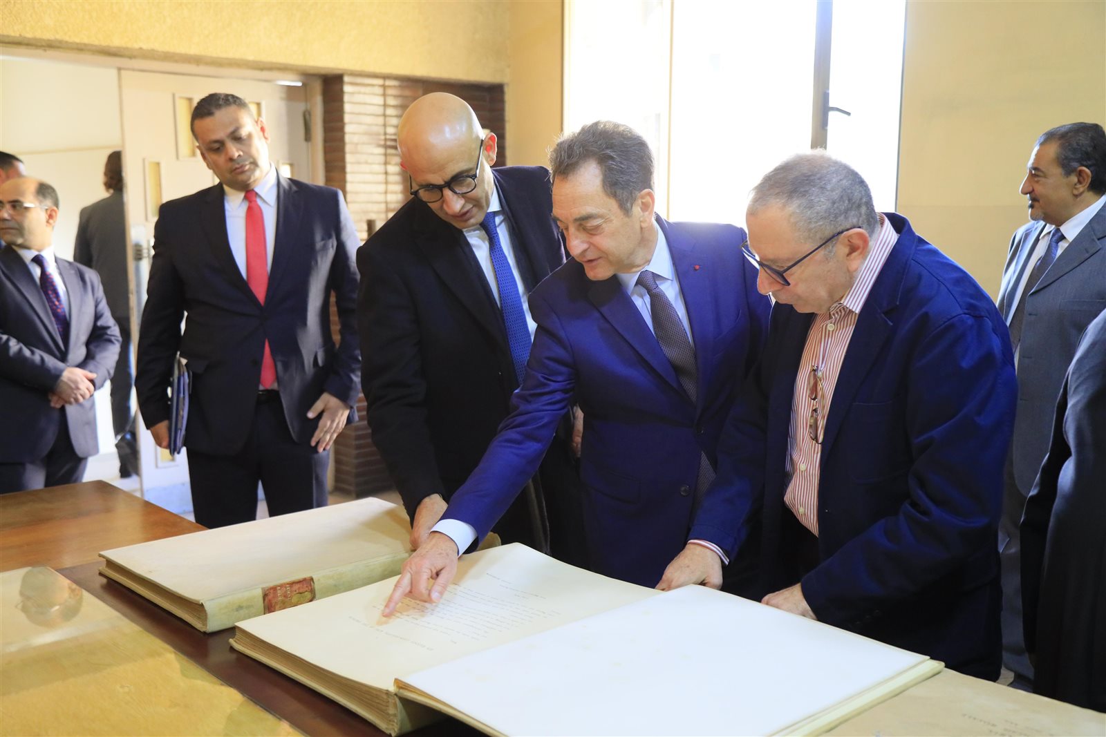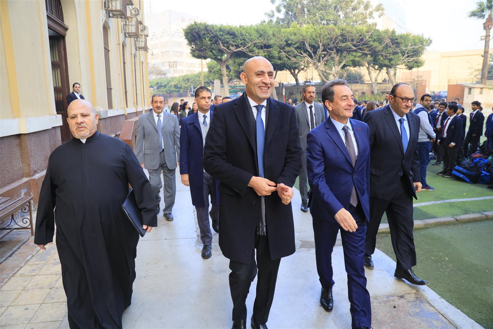 ورافق وزير التربية والتعليم والسفير الفرنسي، خلال زيارتهما السيد دانييل ريجنو ملحق التعاون التربوي بسفارة فرنسا، وفرانك توريس ملحق تعاون اللغة الفرنسية بالمعهد الفرنسي، والسيدة منال جندي مساعدة قطاع التعليم بالمعهد الفرنسي، والأب رومان أمين مدير مدرسة العائلة المقدسة الجزويت.