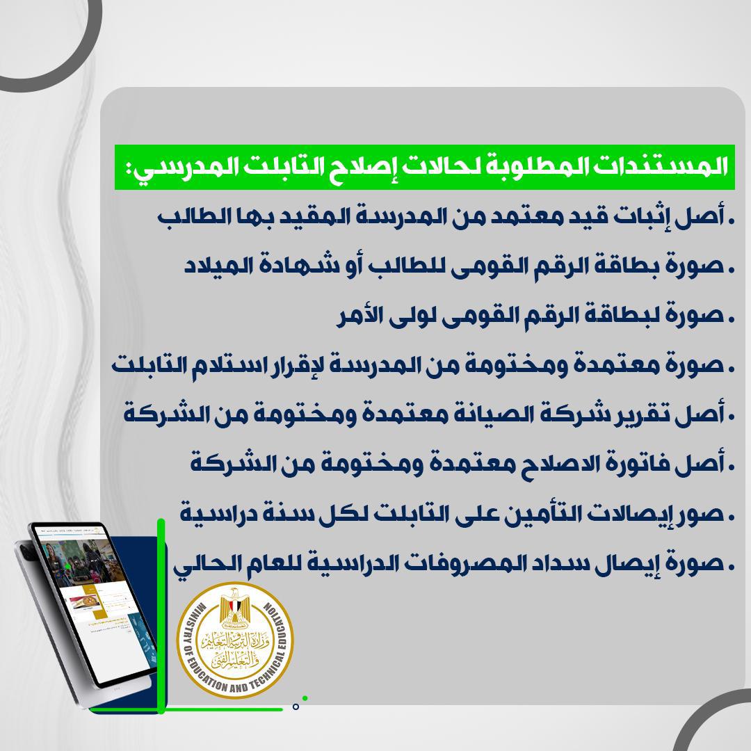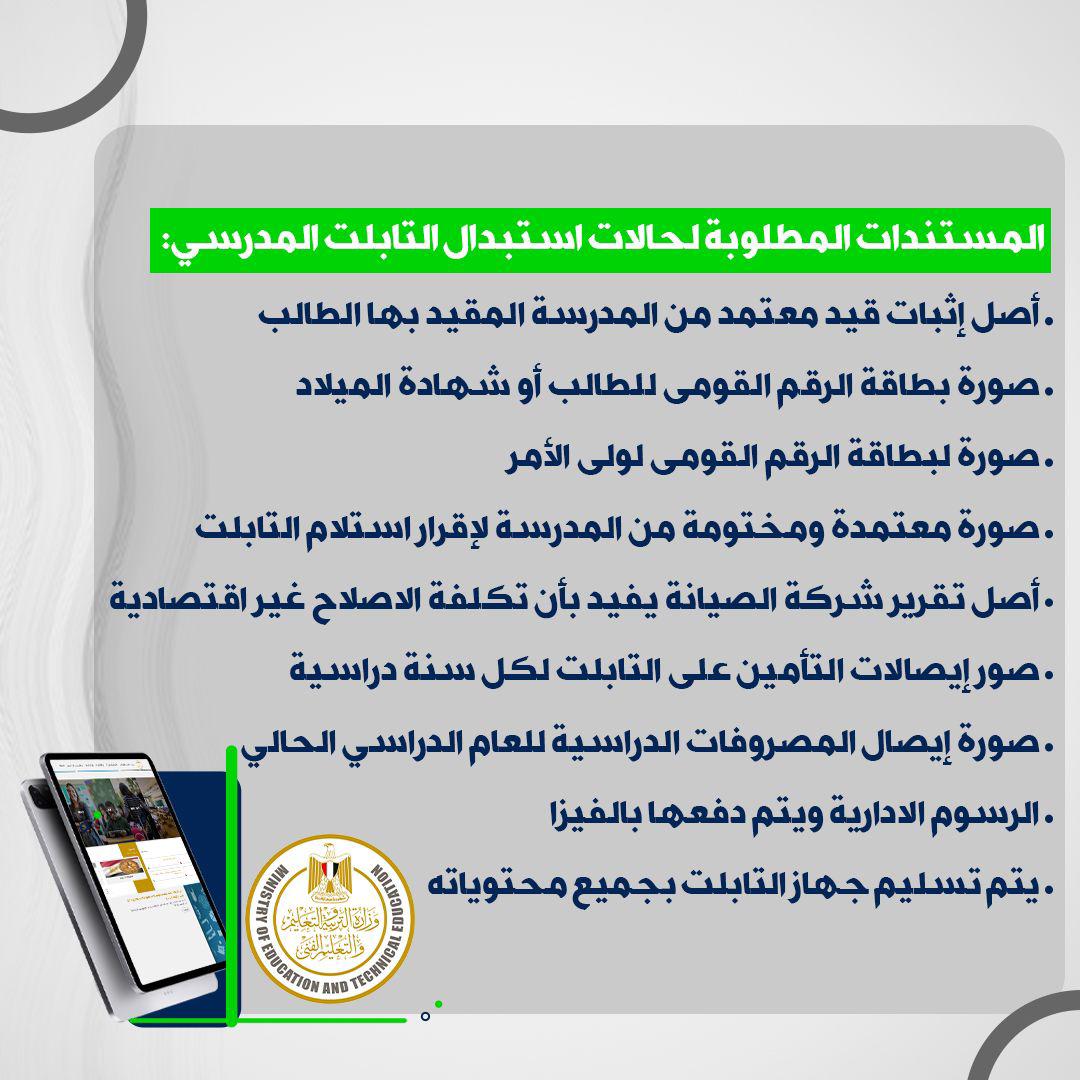 وجاءت المستندات المطلوبة في حالات فقد التابلت المدرسي كالتالي: