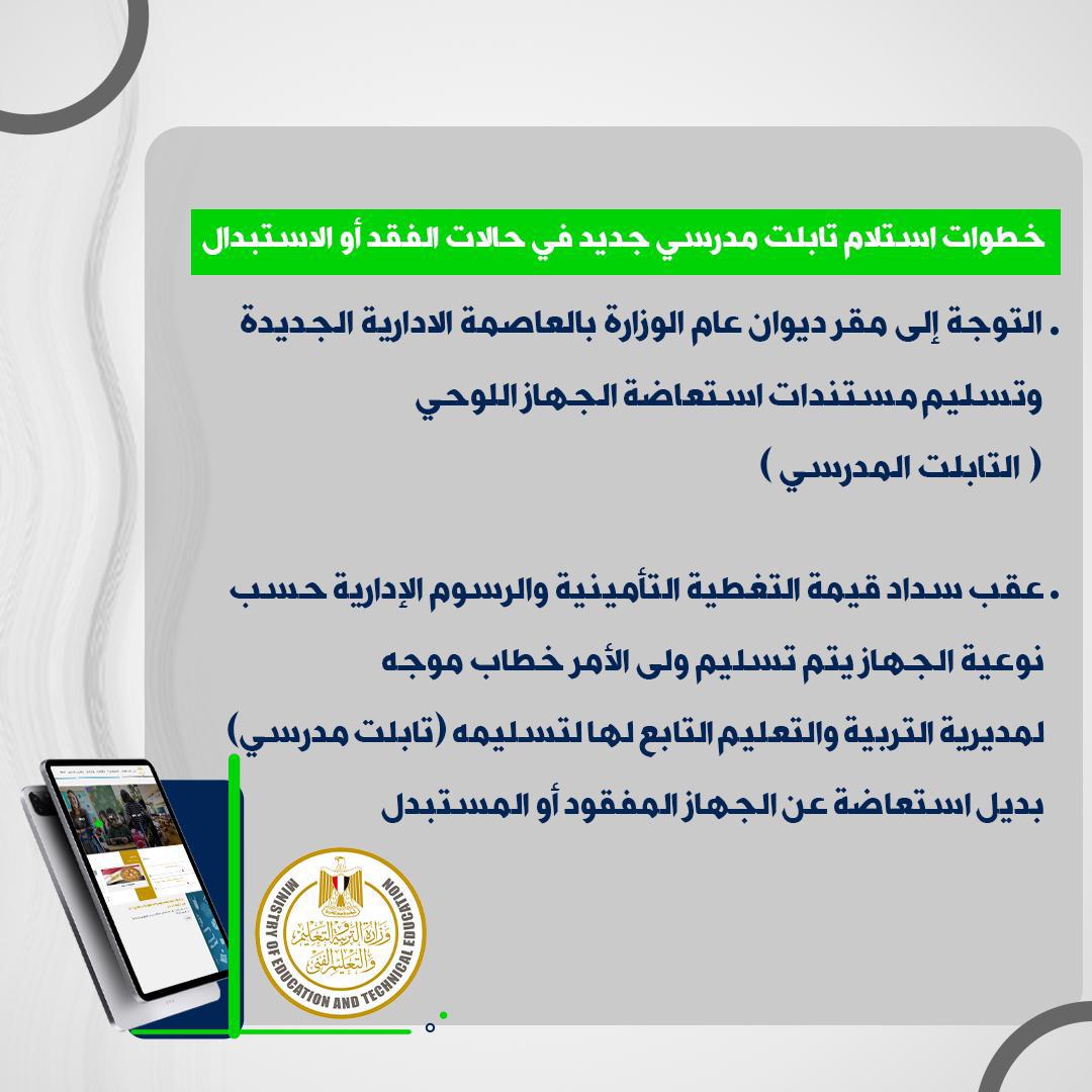 وفي ذات السياق، أرسلت الإدارة المركزية للشئون المالية والإدارية بوزارة التربية والتعليم والتعليم الفني خطابا إلى المديريات التعليمية، موضحة أنه نظرًا لبدء تسليم أجهزة الحاسب اللوحي ( التابلت ) لطلاب الصف الأول الثانوي بالمدارس للعام الدراسي 2024،2025، فقد أصدر رئيس الإدارة المركزية لتكنولوجيا التعليم بديوان عام وزارة التربية والتعليم والتعليم الفني تعليمات بالتأكيد على جميع المديريات التعليمية بعدم تسليم أجهزة التابلت للطلاب إلا بعد دفع قيمة التأمين، مع إرفاق أصل إيصال الدفع مع إقرار استلام الجهاز اللوحي التابلت.