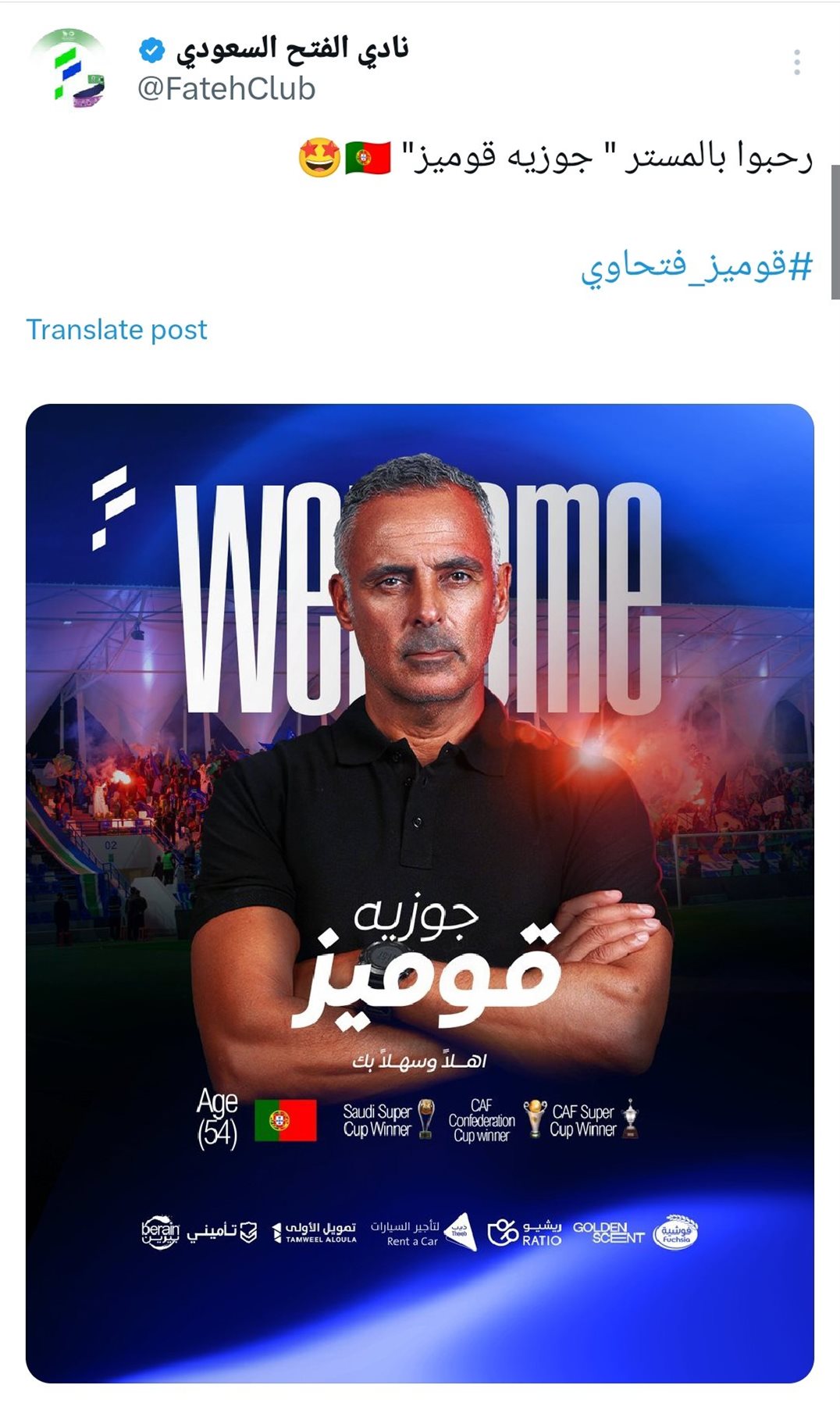 وأعلن الفتح السعودي عبر الحسابات الرسمية على مواقع التواصل الاجتماعي التعاقد مع جوزيه جوميز المدير الفني الأسبق لفريق الزمالك، إذ قال النادي عبر حسابه الرسمي على إكس: رحبوا بالمستر جوزيه جوميز.