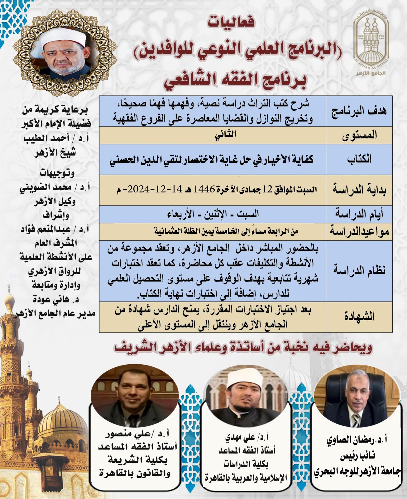 تنطلق اليوم بالجامع الأزهر، فعاليات الدراسة بالمستوى الثاني تخصص الفقه الشافعي، ضمن البرنامج العلمي النوعي للطلاب الوافدين، وذلك برعاية كريمة من فضيلة الإمام الأكبر الدكتور أحمد الطيب، شيخ الأزهر.