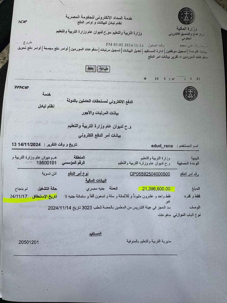 وحصل القاهرة 24، على مستند صرف المستحقات المالية للمعلمين، وسادت حالة من الارتياح المعلمين بعد ورود خطار السداد الالكتروني للحكومة، الخاص بسداد مستحقاتهم المالية عن الفترة الماضية.