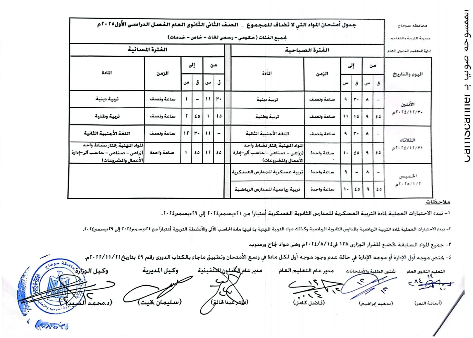 أعلنت مديرية التربية والتعليم بسوهاج جدول امتحانات المواد التي لا تضاف للمجموع للنقل الثانوي العام، للصفين الأول والثاني الثانوي، للفصل الدراسي الأول 2025.