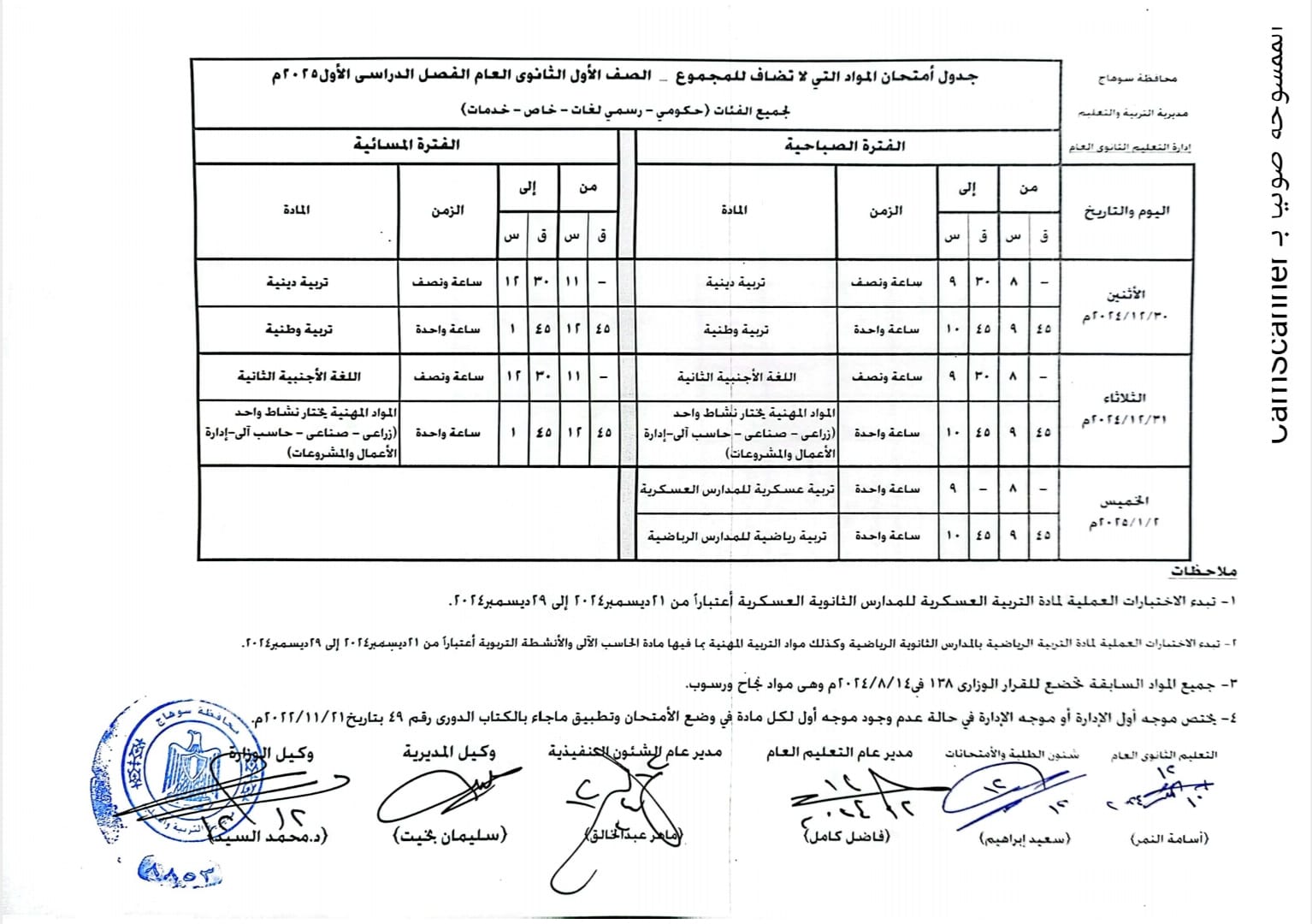 ننشر جدول امتحانات المواد التي لا تضاف للمجموع للنقل الثانوي العام الفصل الدراسي الأول 2025