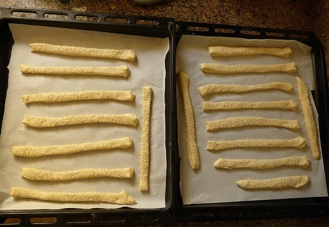 - والآن قسمي عجينة البقسماط إلى أجزاء عديدة وقومي بلف كل جزء رول طويل ورفيع حيث ينتفخ البقسماط أثناء التسوية.