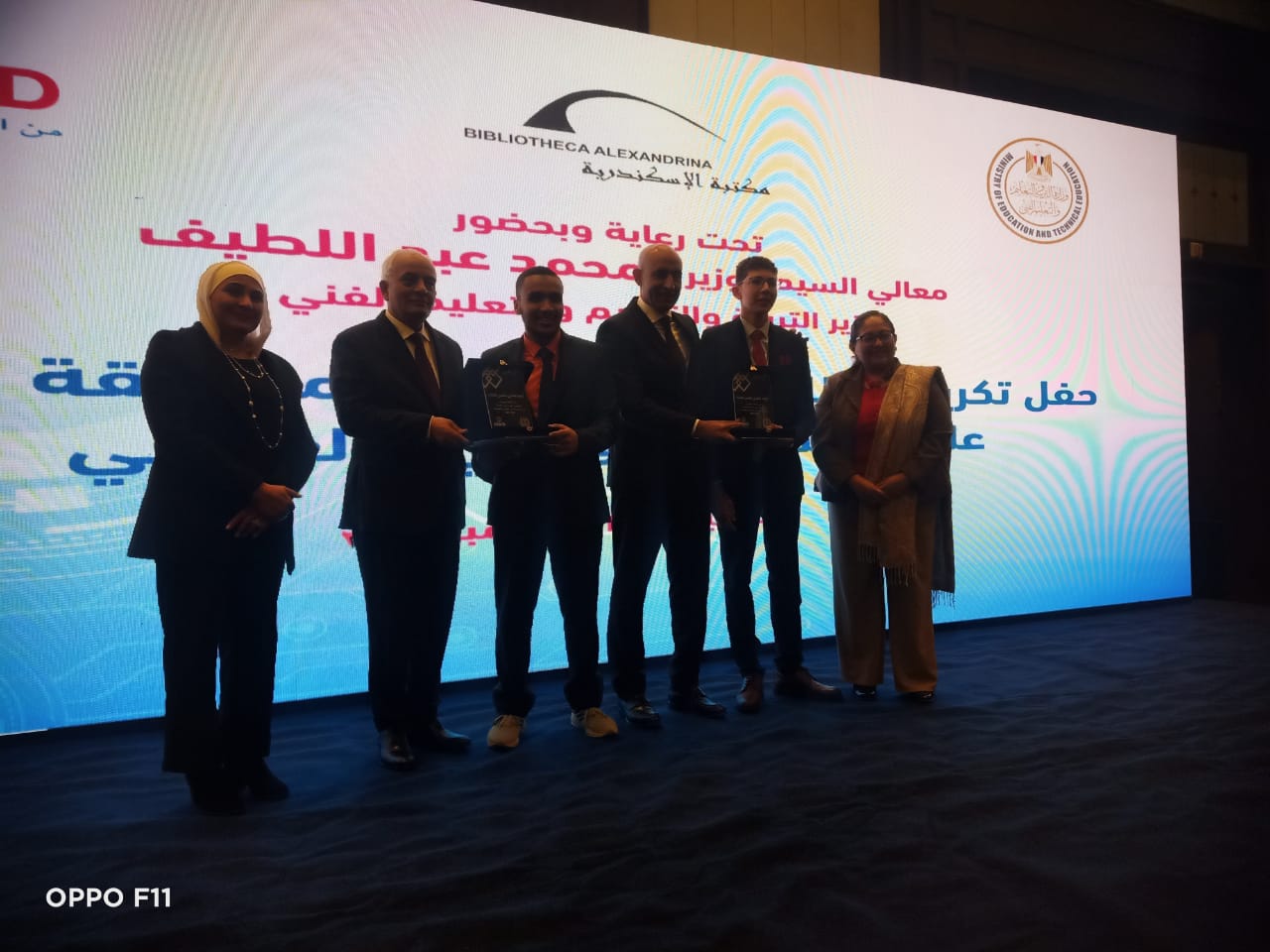 كرم محمد عبد اللطيف وزير التربية والتعليم والتعليم الفني، والدكتور رضا حجازي وزير التربية والتعليم السابق ورئيس جامعة الريادة الطلاب الفائزين في مسابقة آيسف الدولية بمنحهم شهادات تكريم.