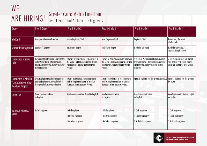 ونشرت الهيئة القومية للأنفاق منشورا لها عبر صفحتها الرسمية على موقع التواصل الاجتماعي فيسبوك، جاء فيه: مكتب المهندسون الاستشاريون العرب محرم _ باخوم، يطلب مهندسين (مدني - كهرباء - معماري) للعمل بمشروع الخط الرابع لمترو أنفاق القاهرة الكبرى.