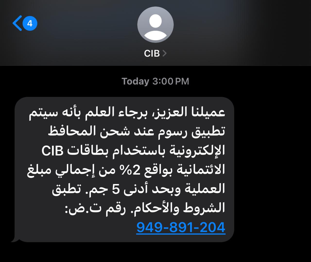 أبلغ البنك التجاري الدولي -مصر CIB، عملاءه أنه سيتم تطبيق رسوم عند شحن المحافظ الإلكترونية باستخدام بطاقات CIB الائتمانية.