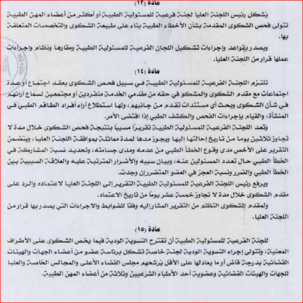 ونصت المادة 13 من مشروع القانون، بتشكيل لجنة تسمى بلجنة المسئولية الطبية، على أن تتولى فحص الشكوى المقدمة بشأن الأخطاء الطبية بناء على طبيعة الشكوى والتخصصات المتعلقة بها، على أن تلتزم اللجنة الفرعية للمسئولية الطبية في سبيل فحص الشكوى بعقد اجتماع أو عدة اجتماعات مع مقدم الشكوى والمشكو في حقه من مقدمي الخدمة منفردين أو مجتمعين لسماع آرائهم في شأن الشكوى وبحث أي مستندات تقدم من جانبهم، ولها استطلاع آراء أفراد الطاقم الطبي في المنشأة، والقيام بإجراءات الفحص والكشف الطبي إذا اقتضى الأمر.