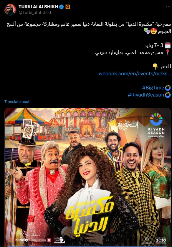 وكتب تركي آل شيخ، خلال صفحته عبر حسابه الشخصي بموقع X: مسرحية مكسرة الدنيا من بطولة الفنانة دنيا سمير غانم، ومشاركة مجموعة من ألمع النجوم.