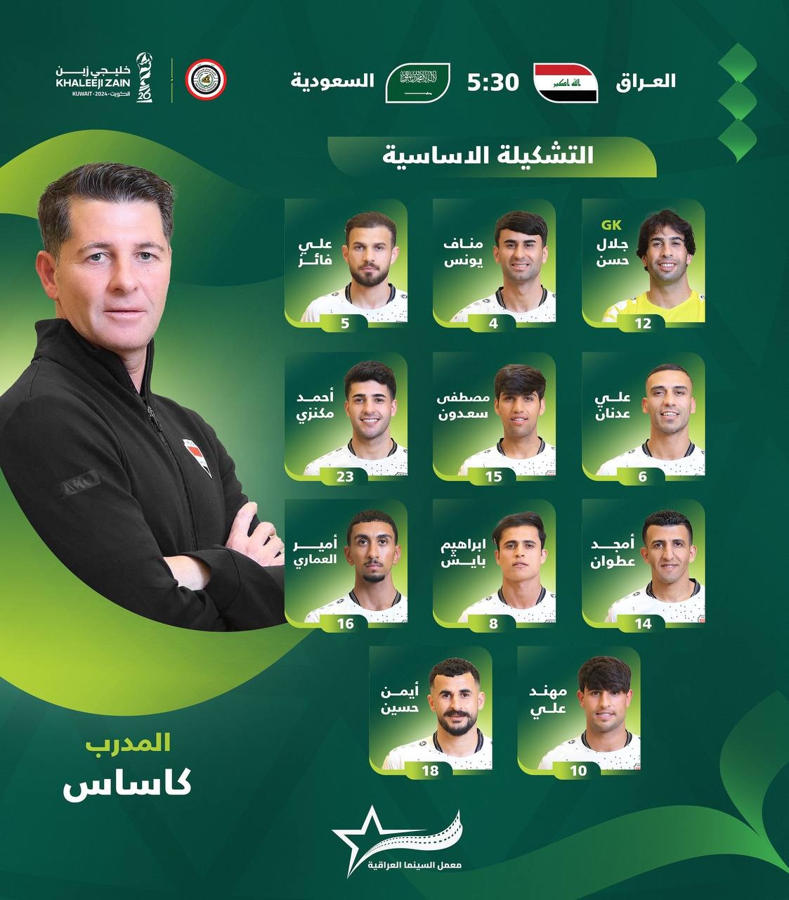 على الجانب الآخر، يبدأ جيسوس كاساس المدير الفني لمنتخب العراق، مباراة السعودية بتشكيل مكون من: