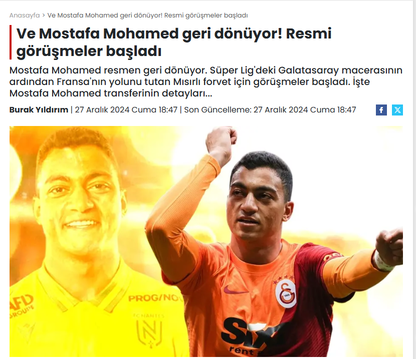 وأكدت الصحيفة التركية، أن سبب رحيل مصطفى محمد عن نادي نانت؛ بسبب أن الفريق الفرنسي يعاني حاليا من صعوبات مالية، ويرغب في رحيل مصطفى محمد، وهو اللاعب الأعلى أجرا في الفريق والذي لم يقدم المستوى المطلوب، مع قيمة انتقاله.