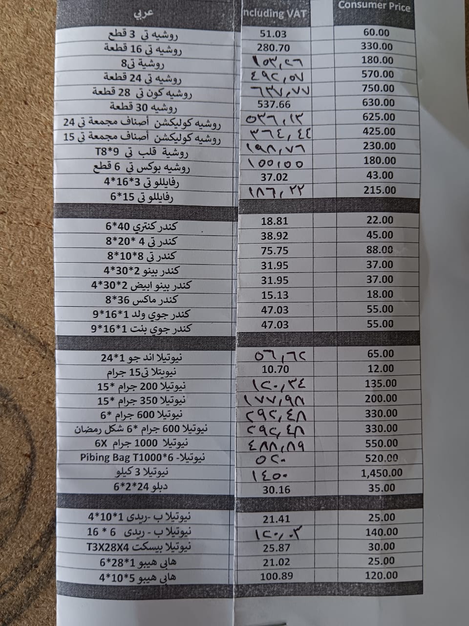 ووصل سعر كندر كنتري 406 إلى 25 جنيها بدلا من 22 جنيها، ووصل سعر نوتيلا اند جو 1*24 إلى 70 جنيها بدلا من 65 جنيها.