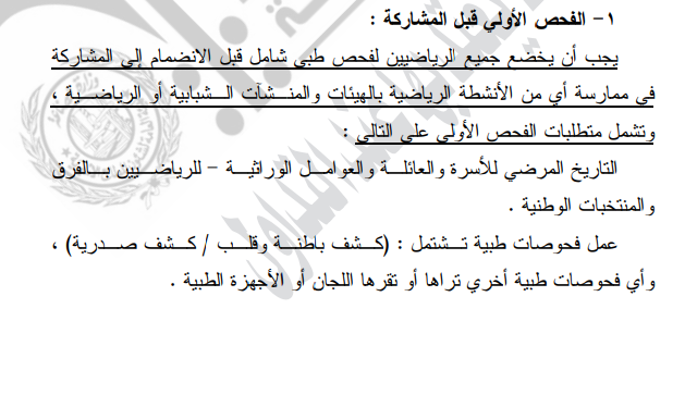 التاريخ المرضي للأسرة والعائلة والعوامل الوراثية، للرياضيين بالفرق والمنتخبات الوطنية، وعمل فحوصات طبية تشتمل: كشف باطنة وقلب، كشف صدرية، وأي فحوصات طبية أخرى تراها أو تقرها اللجان أو الأجهزة الطبية.
